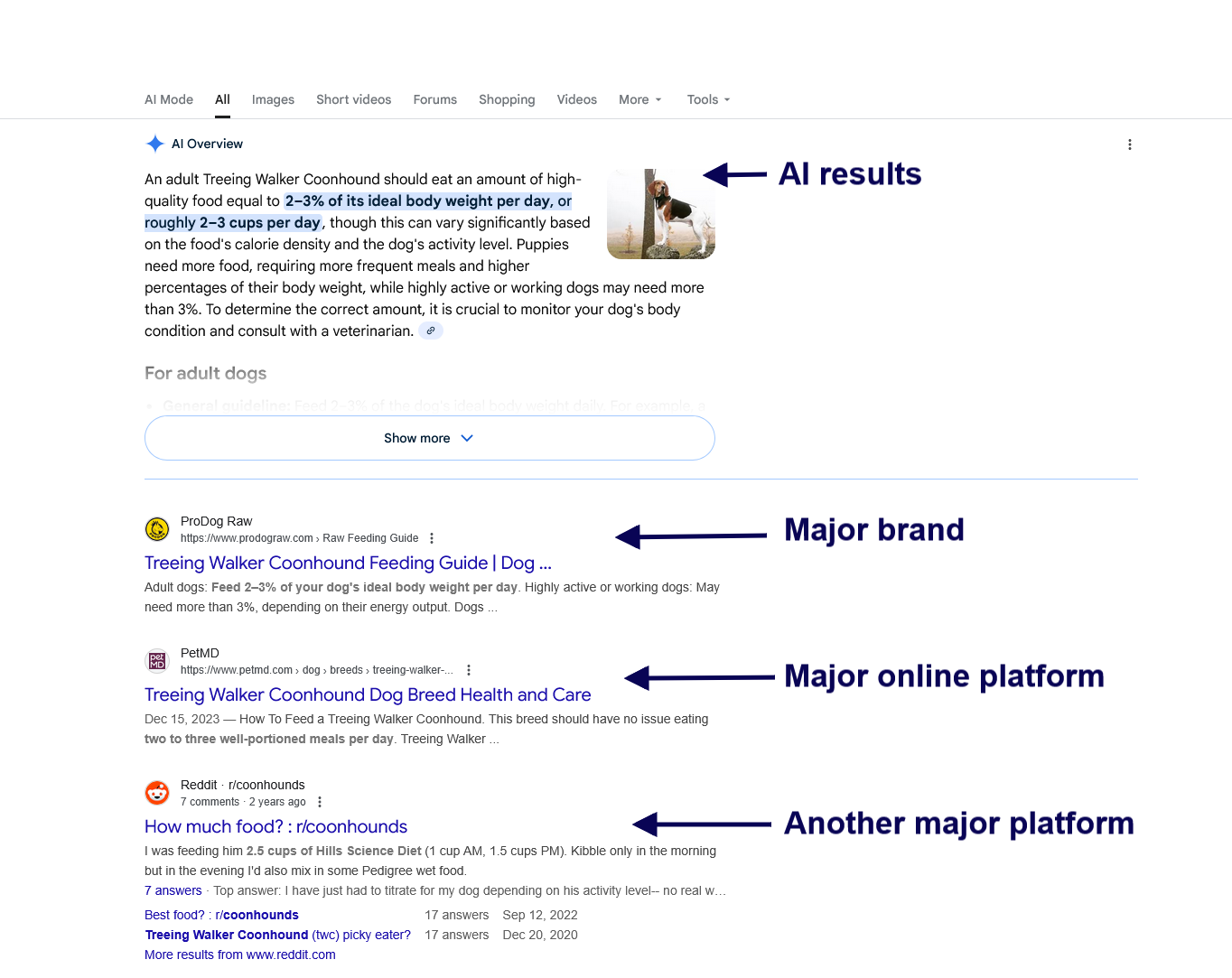In the past, I would have expected to see links to veterinary websites, blog articles, or weight charts. This time, however, the first thing I noticed was an AI-generated answer, followed by results from major brands, discussion forums, and social media platforms. Links to dog food brands and vet blogs were buried much further down.