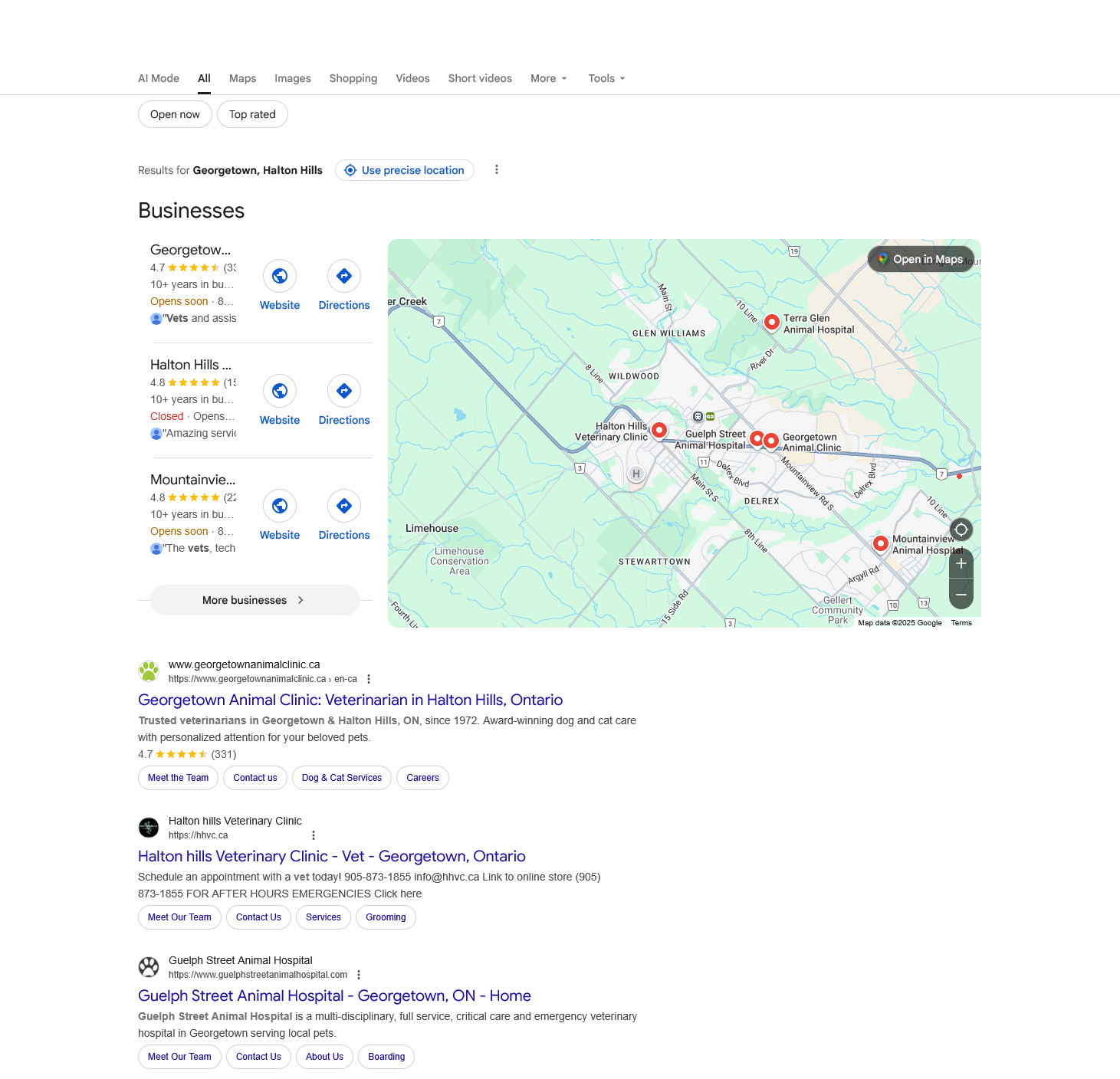 However, when I searched for “veterinary clinic in Georgetown,” I got the traditional Google results – local business listings and a map, with a few paid ads at the top.